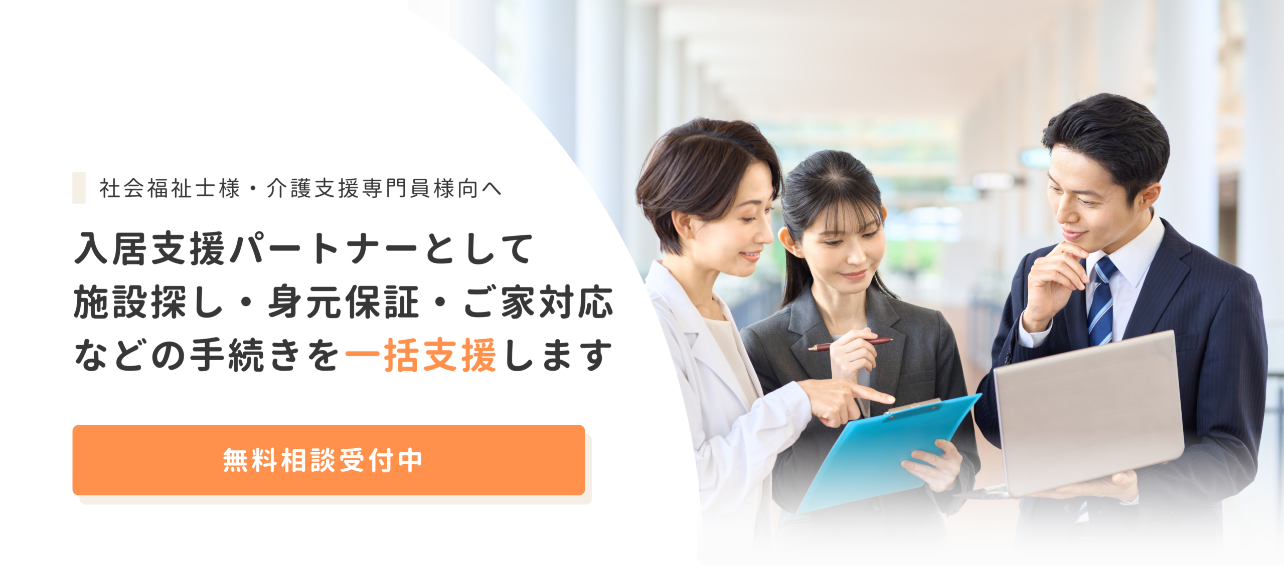 現場経験を持つ医療・介護の専門家と相続に携わる士業が連携し、ご家族一人ひとりの想いや状況に寄り添いながら、施設選びからその後の暮らしまで丁寧にサポートします。