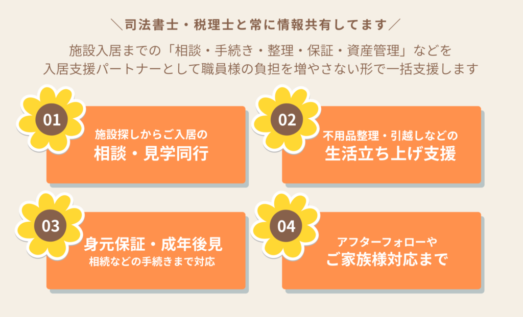 社会福祉士様や介護支援専門員様から、施設探しやご家族対応・身元保証・成年後見制度など、本来の業務範囲を超える部分のご相談を受けることも少なくありません。ひまわりケアーズは、現場の負担を増やさない入居支援パートナーとして、ご家族への説明対応、施設探し、見学同行、専門家相談などを一括してサポートいたします。安心してご相談いただける存在であること。それが、ひまわりケアーズの目指す役割です。